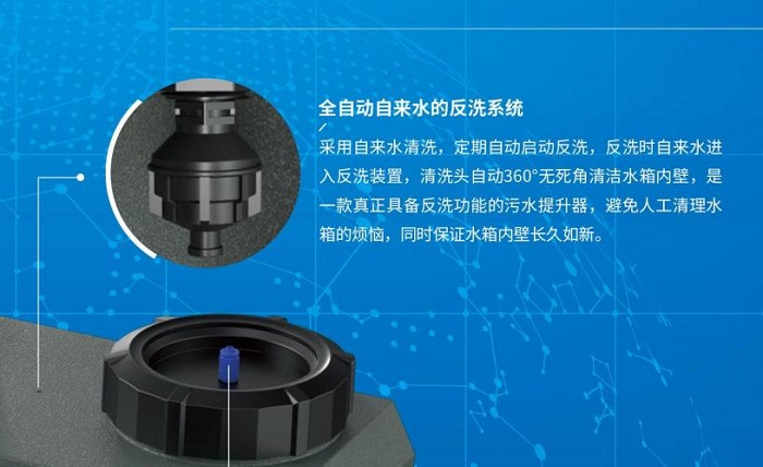 傳統(tǒng)的污水提升器,很多也宣稱有反清洗功能,但是實際上只是誤導(dǎo)消費者,他們所宣稱的反清洗管道,實質(zhì)上是避免水泵發(fā)生氣蝕的通氣管道,并不具備清洗能力。