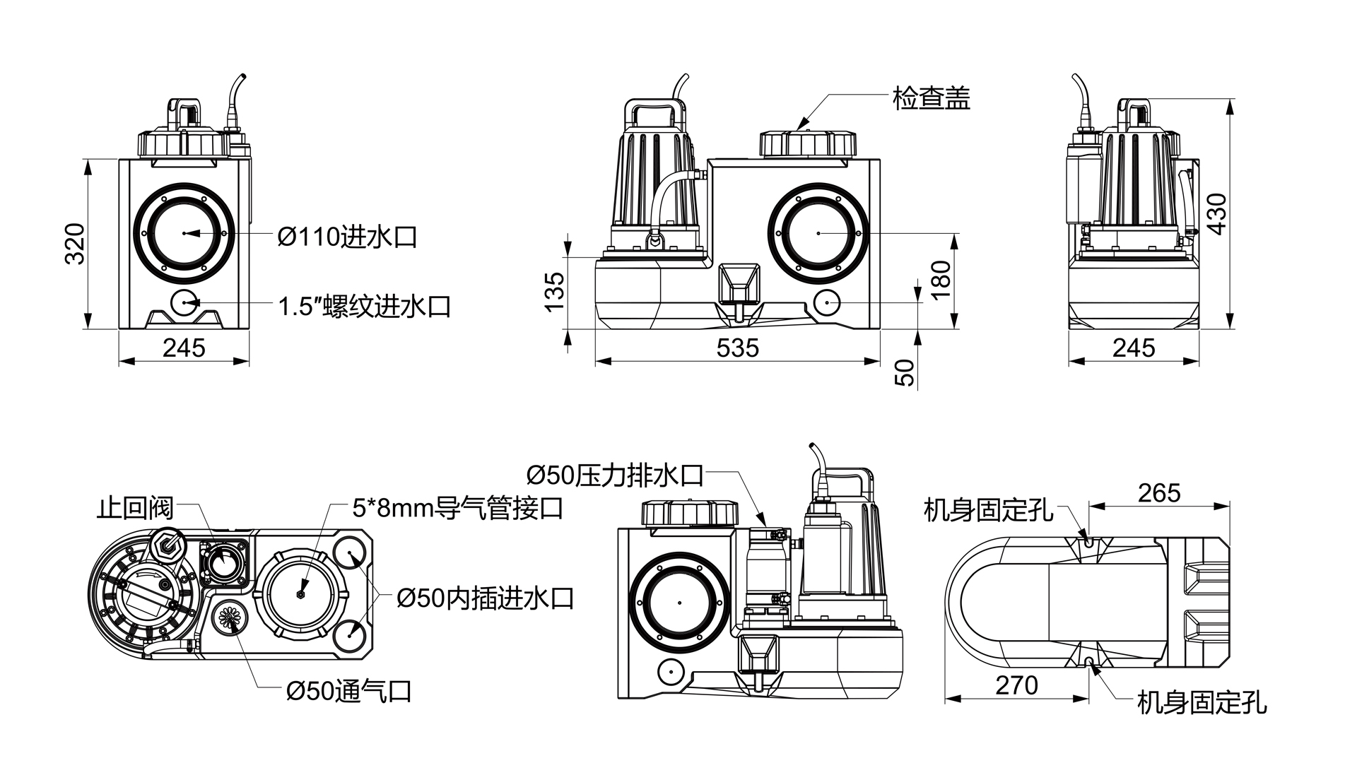 型號 | 功率 | 電壓 | 電流 | 轉速 | 最大流量 | 最大揚程 | 過流直徑 | 重量 |